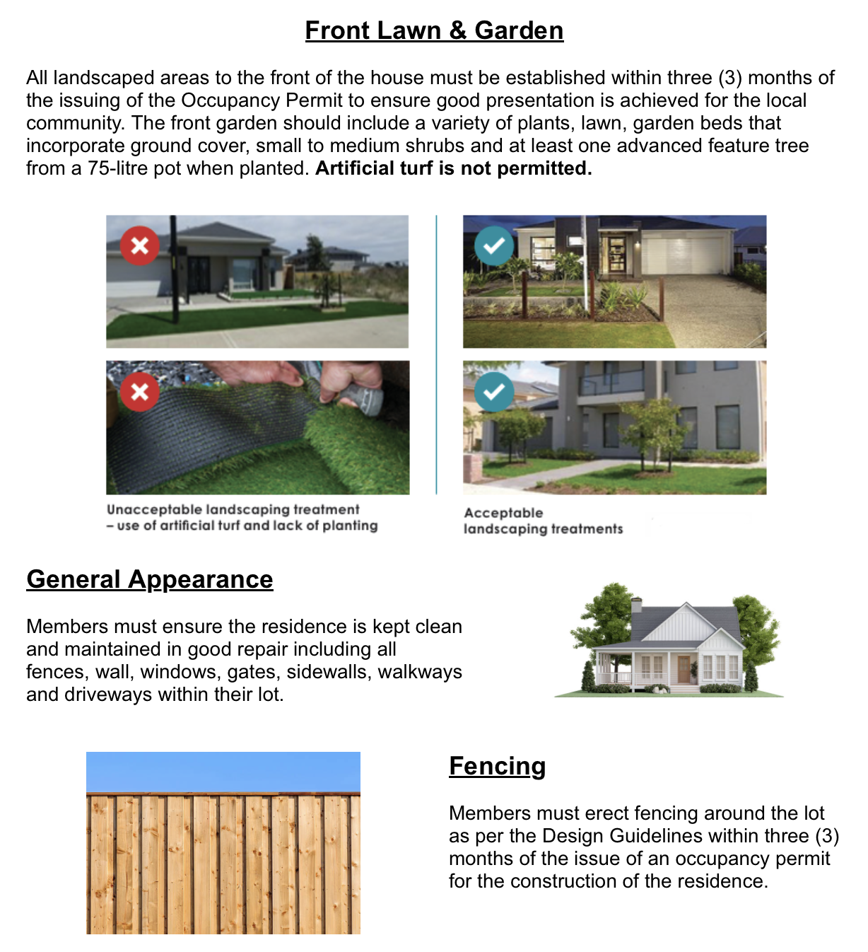 As owners will be aware, part of the attraction and commitment to building and living within the Redstone community is compliance with the governing documents. This includes the Design Guidelines and Owners Corporation Rules that form part of your contract of sale obligations and, that are attached to your title as covenants.